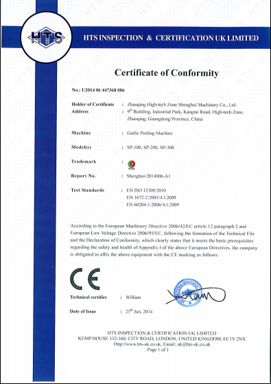 • 大蒜脫皮機獲得CE認證